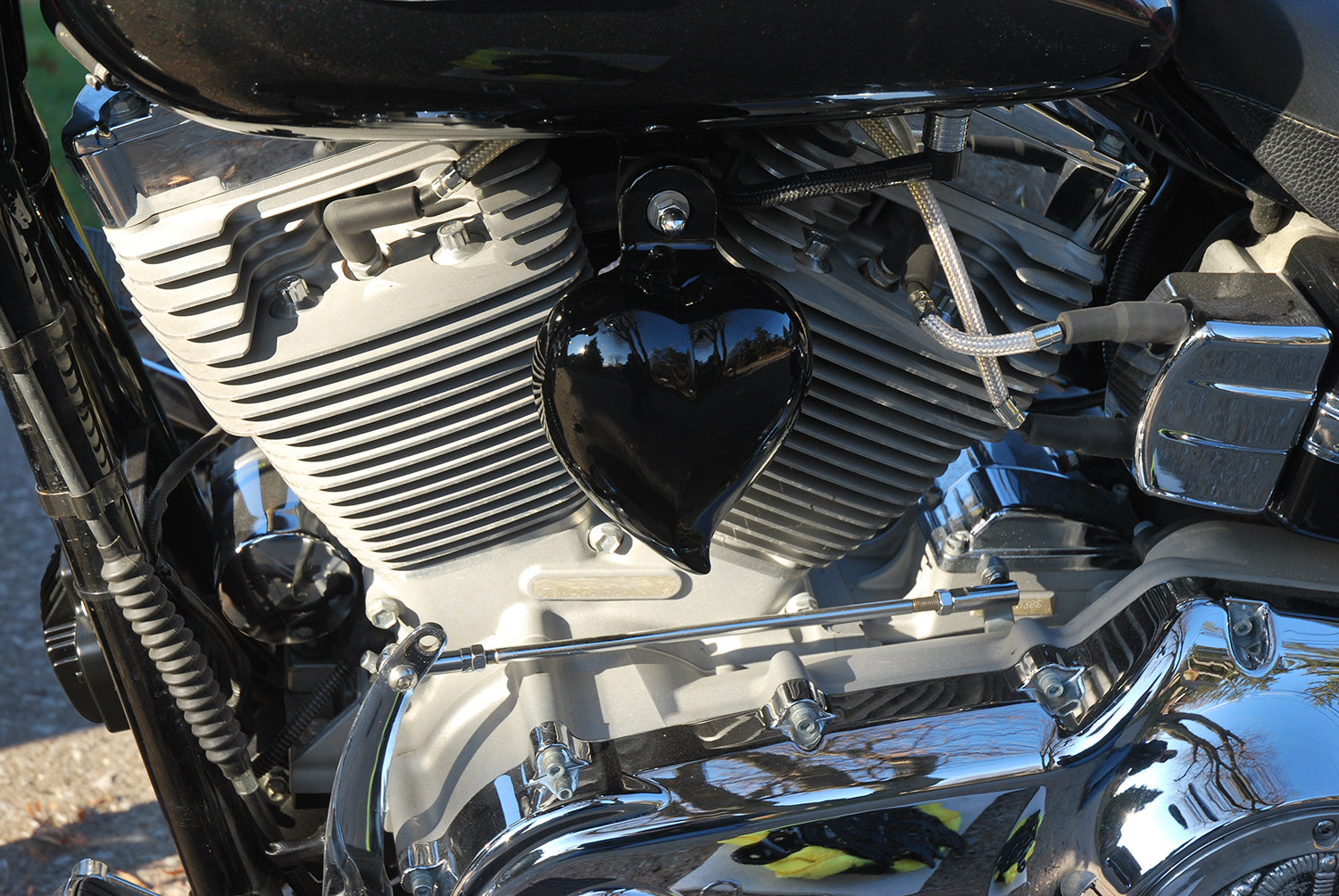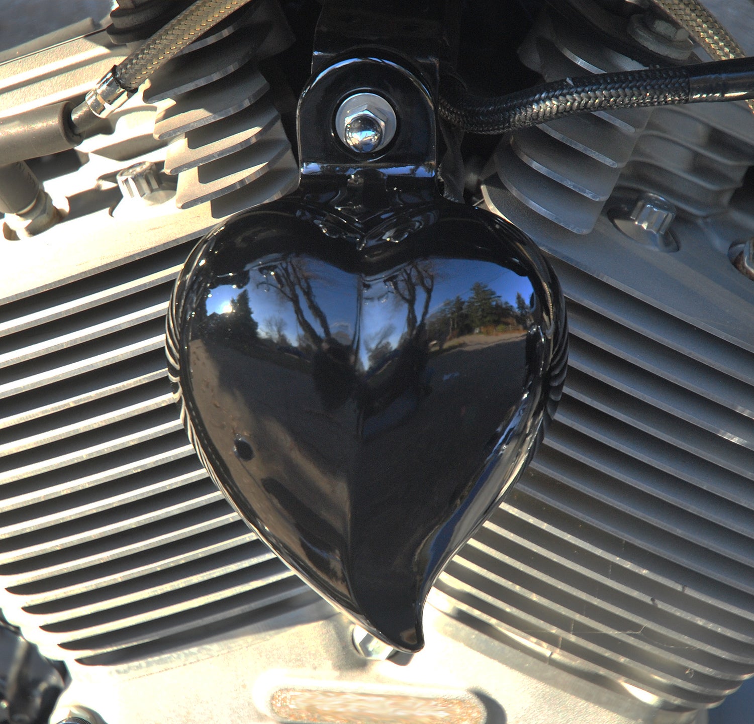 Heart shaped horn cover in brilliant show chrome over 356 cast aluminum or Satin Black and Gloss Black powder coat finish.