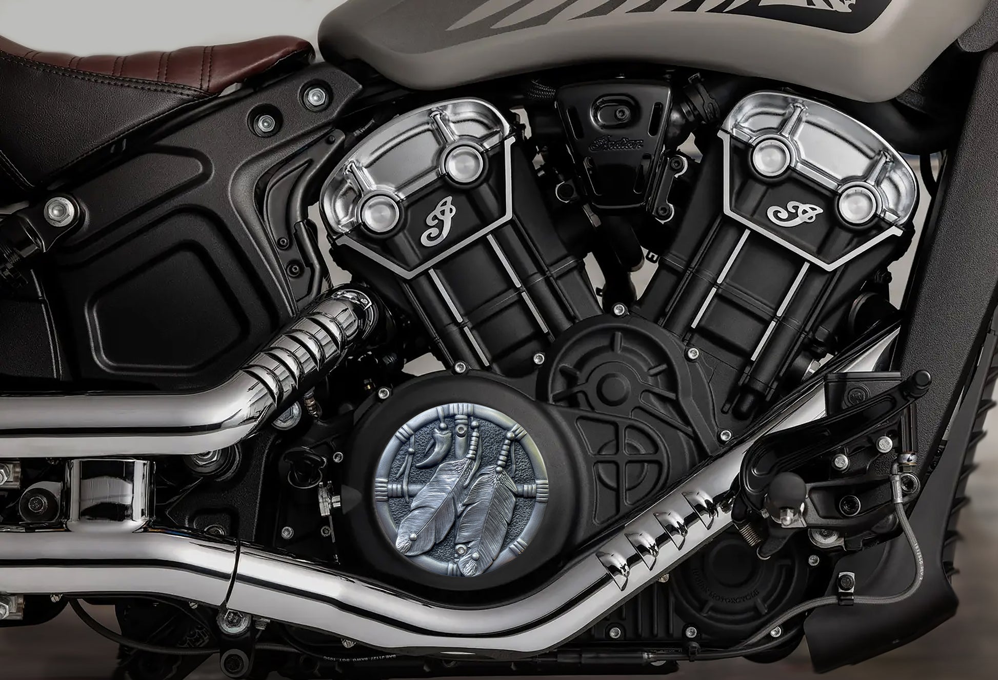 Indian Scout Medicine Wheel Derby Cover with painted Aged finish. Stainless bolts and instructions included.